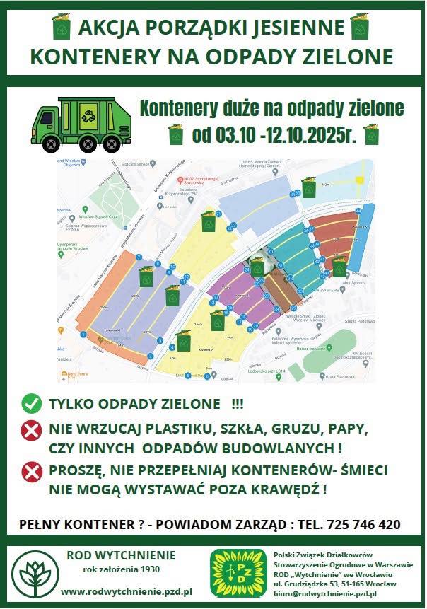 Na okres dwóch najbliższych weekendów, w miejscach zaznaczonych na mapie naszego ogrodu, zostaną rozstawione duże kontenery na ODPADY ZIELONE.