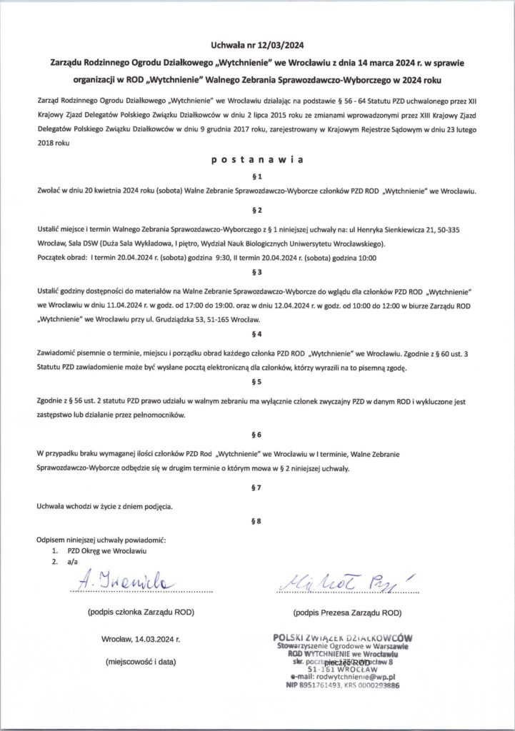 Uchwała w sprawie organizacji Walnego Zebrania.